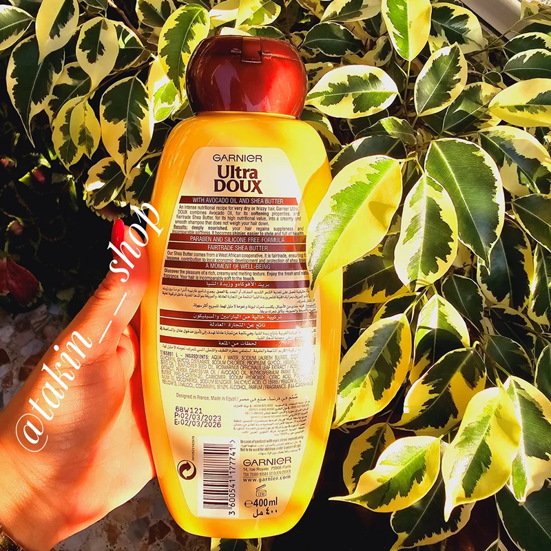 شامپوی نرمکننده و تغذیهکنندهی سری Ultra Doux تحت عنوان «Avocado» تأثیر فراوانی روی موهای خشک و فر دارد . در فرمول این شامپو از دو عصارهی آووکادو و شیباتر استفاده شده است؛ این دو عصاره علاوهبر نرمکنندگی، بر تقویت موهای شما هم تاثیر قابلتوجهی میگذارد.این شامپو موهای خشک و وز را به صورت عمقی تغذیه میکند .شامپو مغذی آووکادو شی باتر گارنیر(Garnier Ultra Doux 400ml) حاوی دو ویتامین A و E میباشد ، این دو ویتامین از جمله ویتامین های لازم جهت تقویت پوست و مو است.