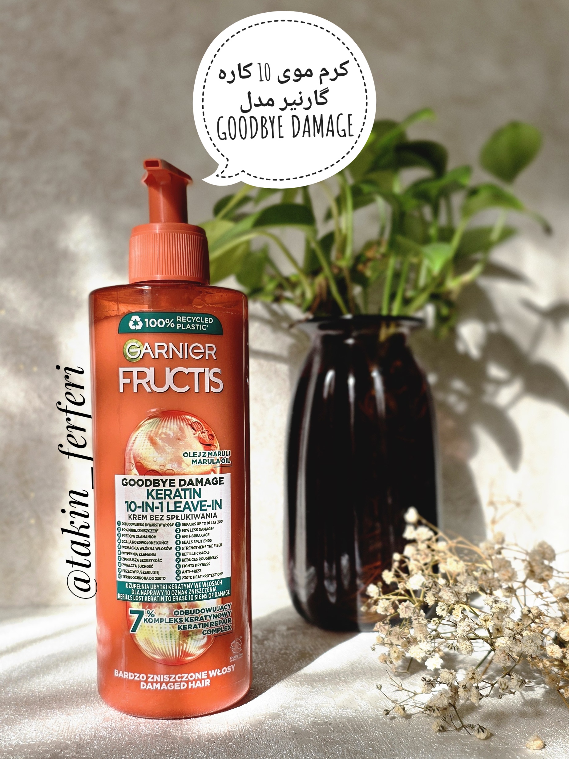 كرم مو گارنير 10 در 1 مدل Damage Goodbye حاوى كراتين مناسب موهاى آسيب ديده و شكننده 400 ميلى ليتر محصولى جديد و بسيار با كيفيت و داراى فرمولاسيونى غنى از كراتين گياهى مايع، عصاره روغن آملا و ويتامين B3 براى ترميم و تقويت موهاى آسیب ديده و شكننده و استحكام بخشى هر چه بيشتر به موها از برند گارنير فرانسه است. كره موى 10 كاره گارنير مدل DAMAGE GOODBYE بر روى موهاى تميز ، خشک و يا مرطوب مورد استفاده قرار میگيرد و استفاده مداوم و منظم از آن بتدريج جلوه اى دوباره به موها مى بخشددر واقع، استفاده مداوم و مرتب از اين محصول، موهايى خوش حالت، براق، با طراوت و عارى از هر گونه آسيب را به ارمغان می آورد. اين محصول، ترميم كننده، ضد شكنندگى و محافظت كننده از مو تا دماى 230 درجه بوده و داراى بافت سبك جهت جلوگيرى از سنگينى موها است و بعد از استفاده از آن نيازى به آبكشى موها نمى باشد.