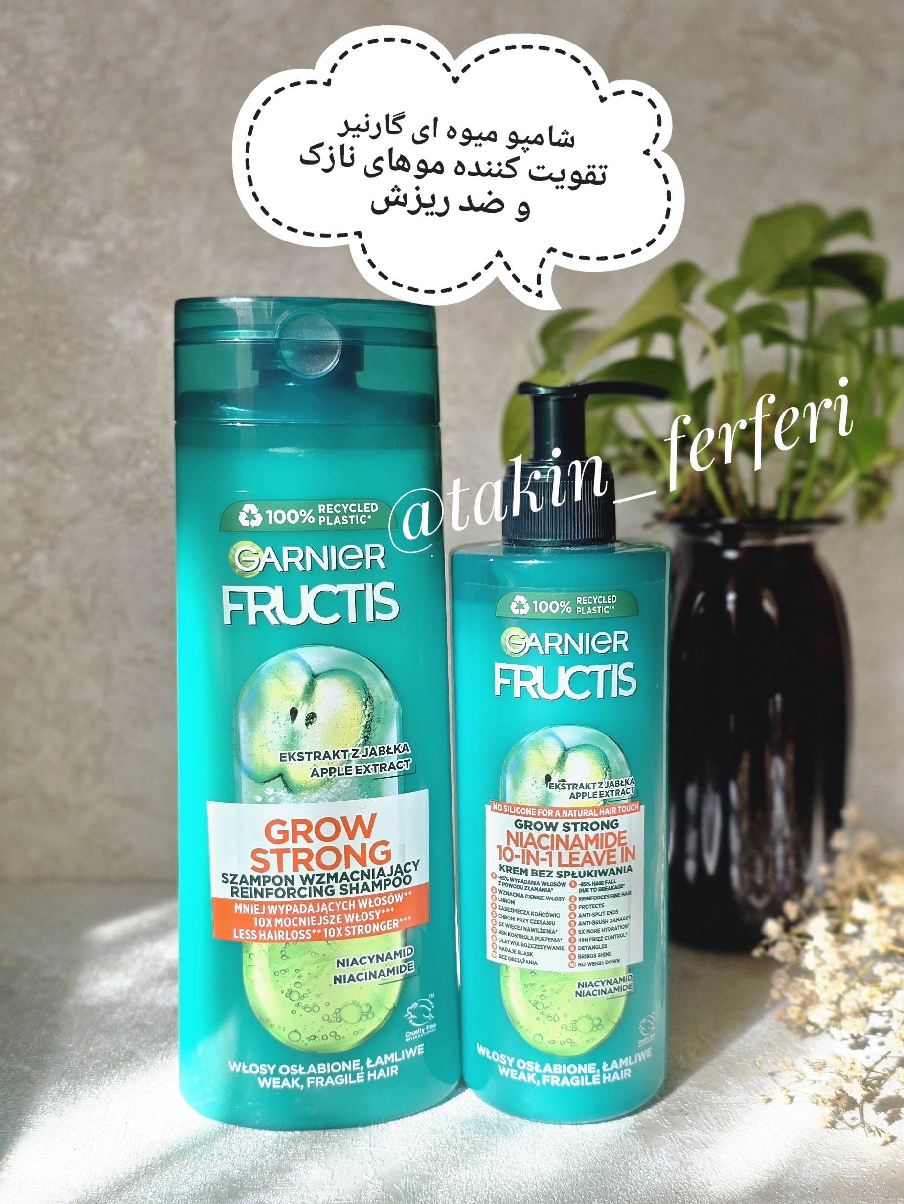 کرم موی 10 کاره گارنیر فروکتیس مدل GROW STRONG محصول مراقبتی بعد از حمام، بدون نیاز به آبکشی و مناسب موهای ضعیف و مستعد به شکنندگی می باشد. این کرم مو حاوی نیاسین و عصاره سیب با خواص 10 گانه برای موهای ضعیف می باشد. کرم موی گرو استرانگ گارنیر ضد ریزش ناشی از شکنندگی، تقویت کننده موهای ضعیف و نازک، محافظ و ضد آسیب مو در برابر براشینگ، براق کننده، صاف کننده، آبرسان و ضد گره خوردگی مو می باشد. این کرم دارای بافت سبک جهت جلوگیری از ایجاد سنگینی بر روی موها می باشد. شامپو حاوي عصاره ميوه گارنير مدل Garnier Grow Strong حاوي عصاره گريپ فروت و ويتامين هاي B3 و B6 است که باعث مي شود ريشه موهاي شما بدرخشد و احساس طراوت و شادابي را به موهاي مي بخشد . اين شامپو بدون پارابن است که حاوي مواد تقويت کننده ميوه هستند .اين شامپو با عصاره هاي ميوه و گياهان با اثربخشي بالا اثبات شده است تا موهاي سالم و قوي تري به شما ارائه دهد.