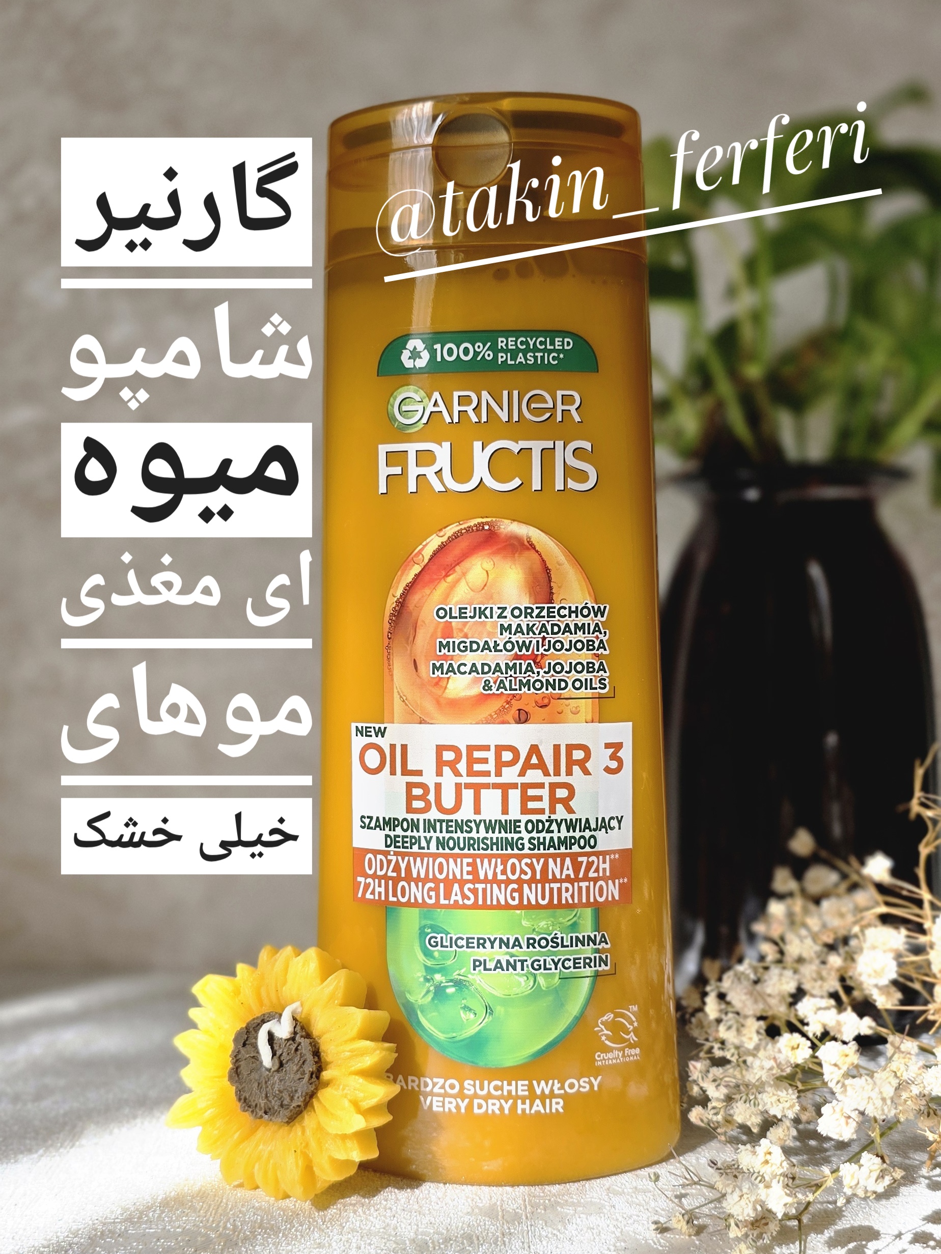 شامپو ترمیم کننده روغن های مغذی گارنیه Garnier Oil Repair 3 حاوی کره و روغن های ارگانیک جهت ترمیم و احیای سلامتی موهای خیلی خشک و آسیب دیده می باشد.این محصول حاوی روغن ماکادمیا (فندق استرالیایی)، روغن بادام، روغن جوجوبا و روغن نارگیل است که ضمن تغذیه و ترمیم کامل مو سلامتی و نرمی آن ها را احیا کرده و علاوه بر این حاوی تری گلیسیرید جهت ترمیم بازسازی سلامت موها می باشد.